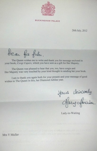 Some months ago, I sent the Queen of England a copy of Corgi Capers to celebrate her Diamond Jubilee. I figured: the Queen loves corgis, and the book makes reference to certain elements of British history. The story takes place in Pennsylvania and includes references to the War of the Roses (with Lancaster and York Counties in PA being named after their counterparts in England). In fact, Adam’s baseball team is called the Reds, with the red rose inside of a baseball as their logo. I wasn’t sure about British etiquette, and I didn’t know whether she’d personally receive or respond to my gift, but a few of my friends and family members encouraged me to send it. This summer I received a letter from the Queen’s Lady-in-Waiting: