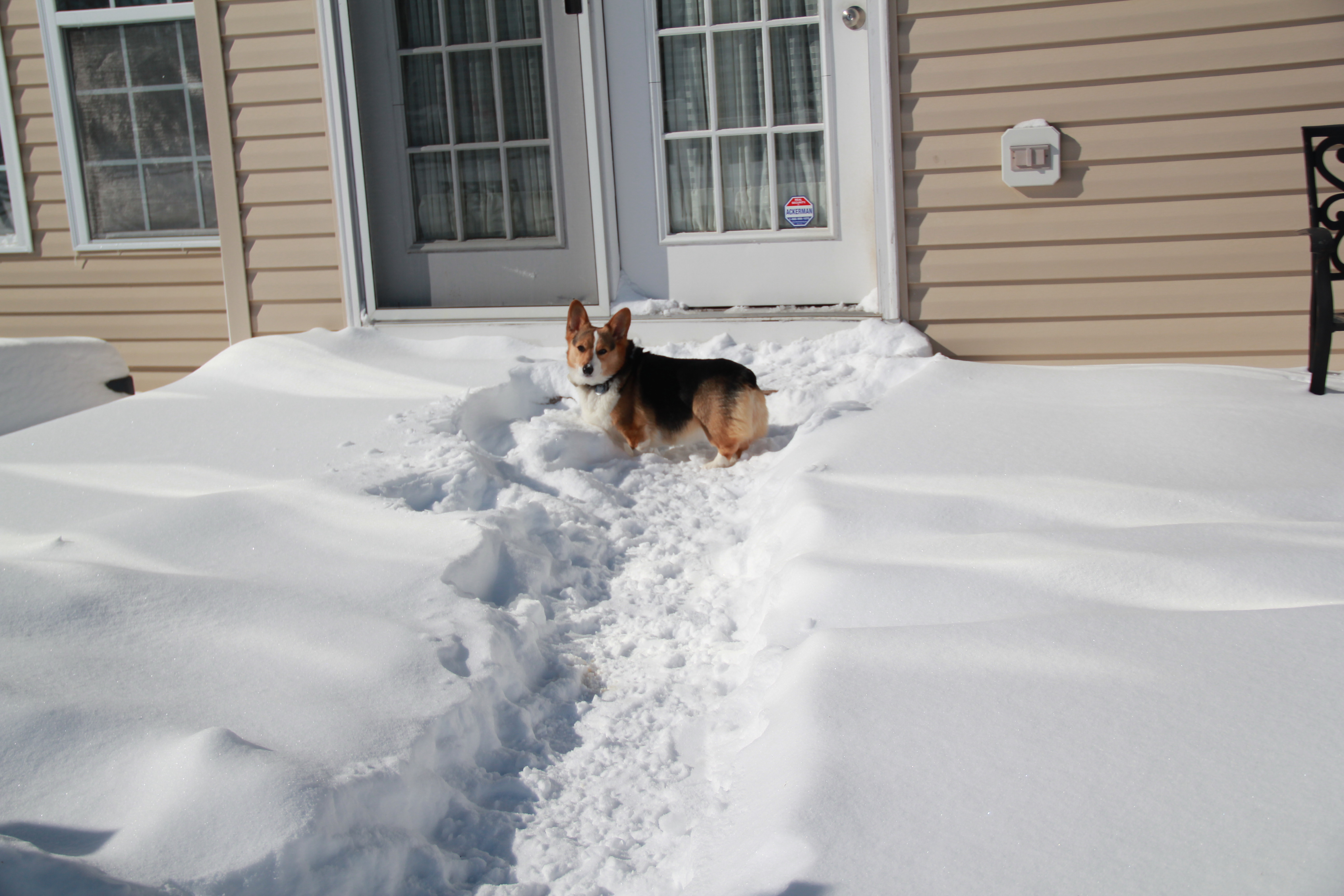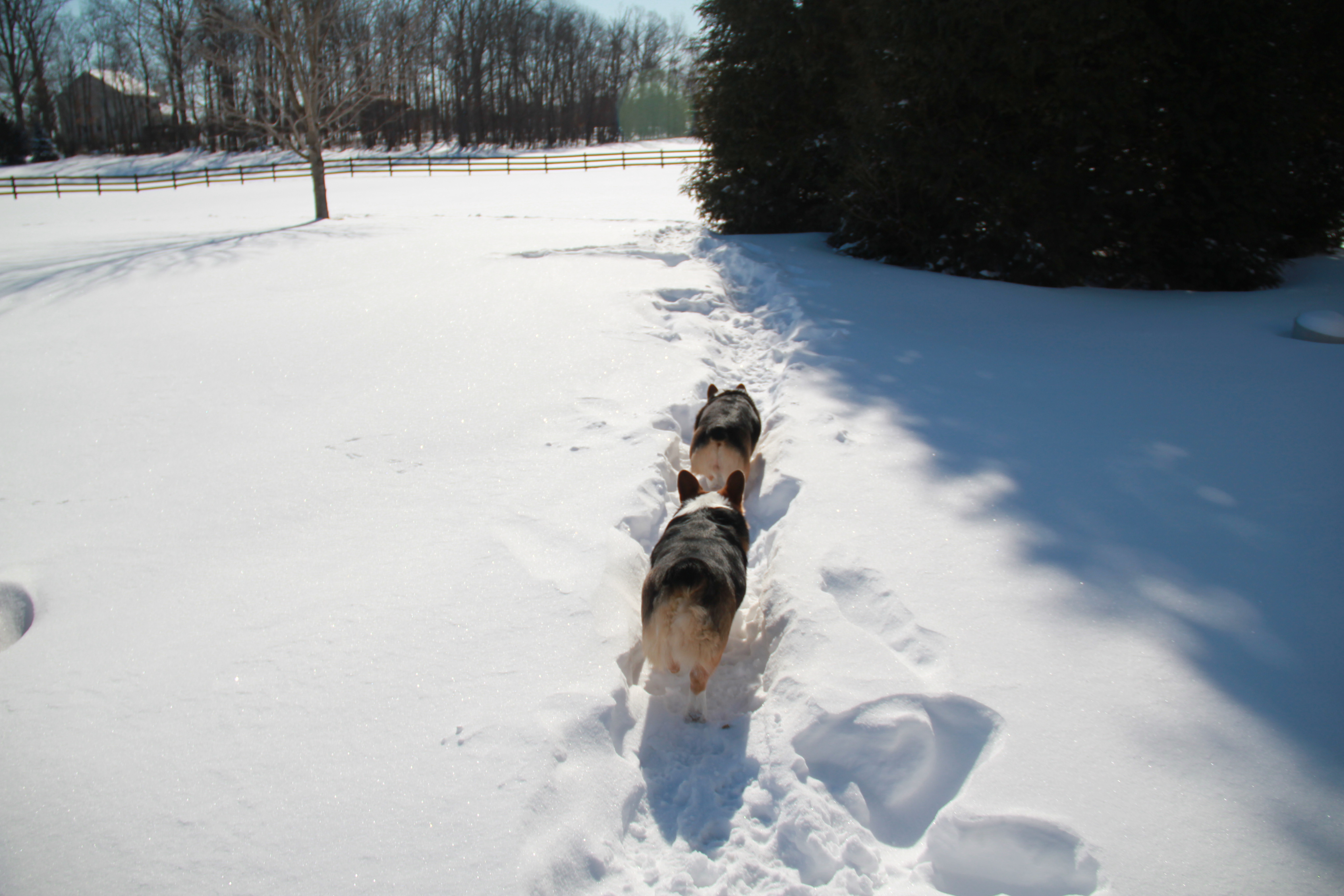 This week’s spring warm-up has brought us out of the dreaded “Arctic blast” of the last few weeks. It’s a relief not to have to keep those pipes dripping anymore. I thought I’d wish winter good-bye with one more set of corgi snow pictures. I always love the days after a snow storm, when the sun arrives to create a great contrast between the deep blue sky and the stark white ground. And, of course, the corgis keep it lively as ever. Enjoy!