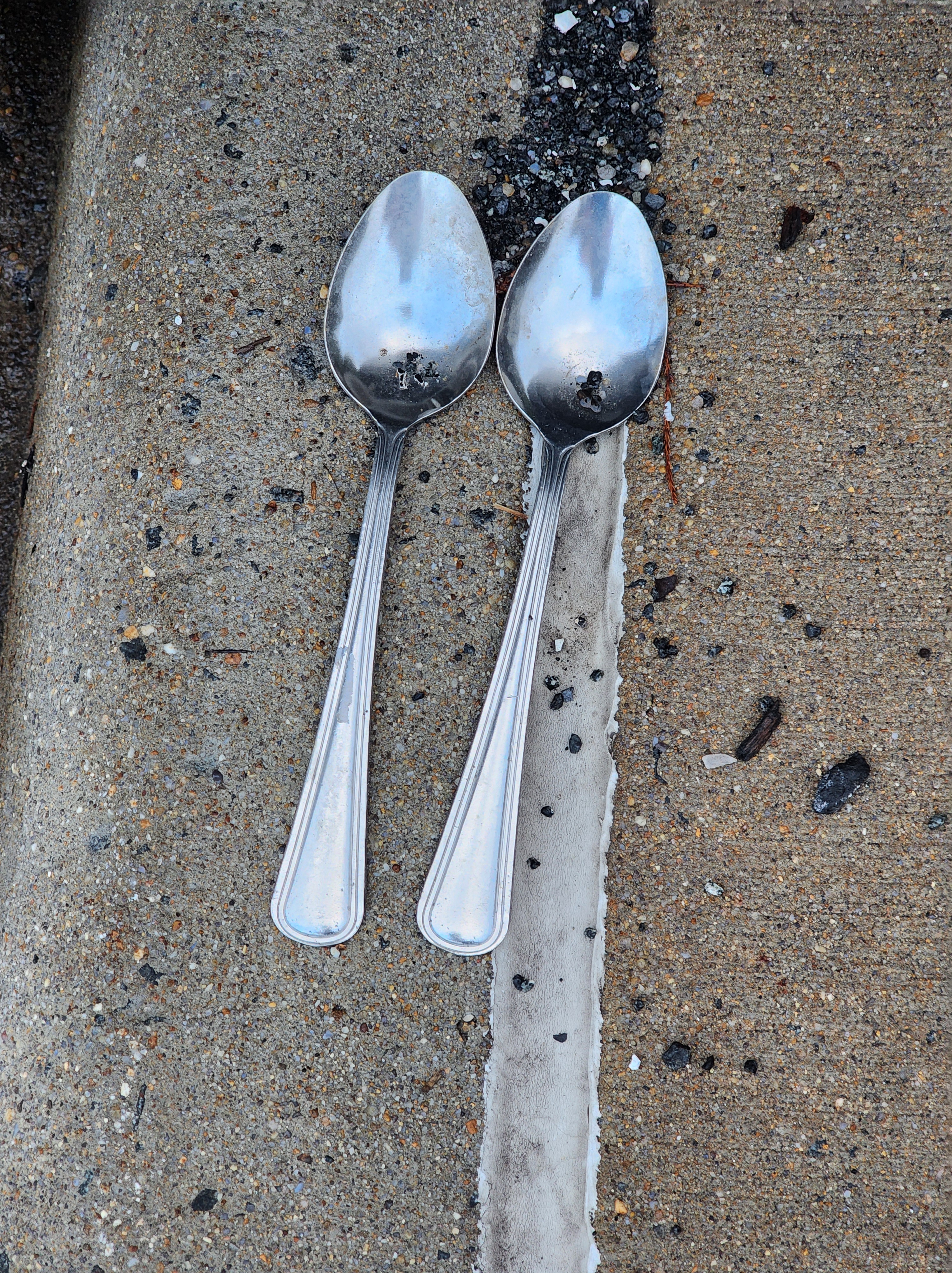 That same breeze was playing with my hair as, walking back, my arms laden with grocery bags, I saw two spoons on the sidewalk. They were metal spoons, placed intentionally next to each other in the corner of the sidewalk. I wondered who placed them there and whether they had a purpose. Of course my mind shot back to spoonfuls of peanut butter or soup or (non-chocolate) ice cream or whatever dogsafe food I would eat and give to my two pups to sample.