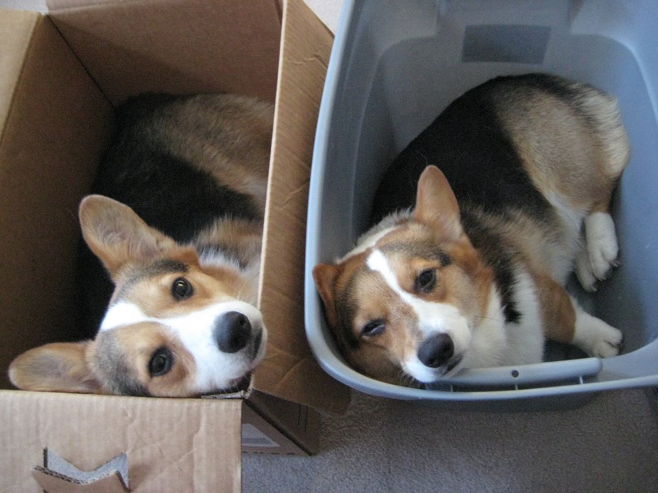 There are a few empty boxes I’ve saved because the corgis still love to sleep in them. Here’s a picture of them after a long, hard morning of chasing the green laser around: