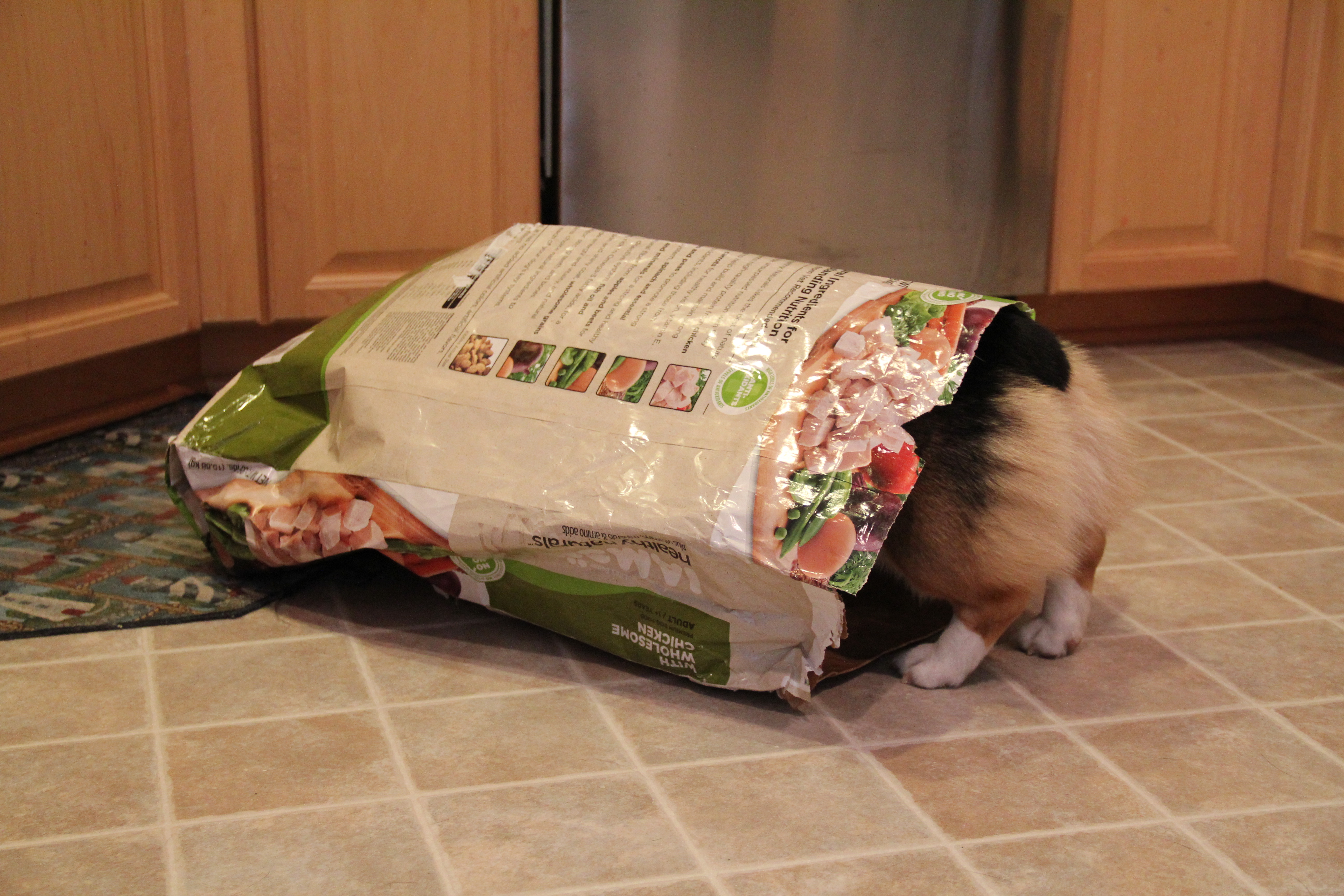 Her excitement is not limited to walks. Among her many loves: water. She loves baths. She will sometimes run up to the bathtub and sit on the bathmat, waiting for me to wash her. She loves splashing around: once when a pipe burst in the basement, Leia had a great time splashing around on the saturated carpet. She also loves drinking water, but she does so by plopping her front paw (or paws, depending on how hot it is) into the water… so that when she is done drinking, she leaves little wet pawprints all over the house. She loves chewing on cardboard: an empty shoebox will keep her entertained for hours (as long as we keep an eye on her–otherwise, she’ll eat the cardboard!) She also loves to play with empty bags of dog food. One day when I couldn’t find her, I ran all over the house and even checked the back yard. It turned out that she was hiding–she was sleeping inside the empty bag of dog food!