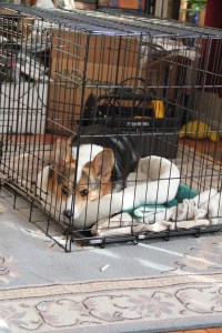 Leia, like Sapphie, was fearless. She jumped into her crate and went right to work on the bone, ignoring the contractors that bounded up and down the steps all morning.